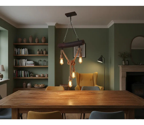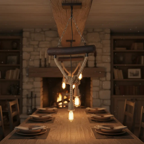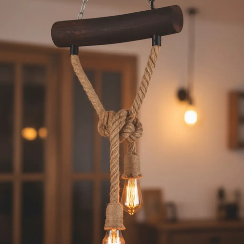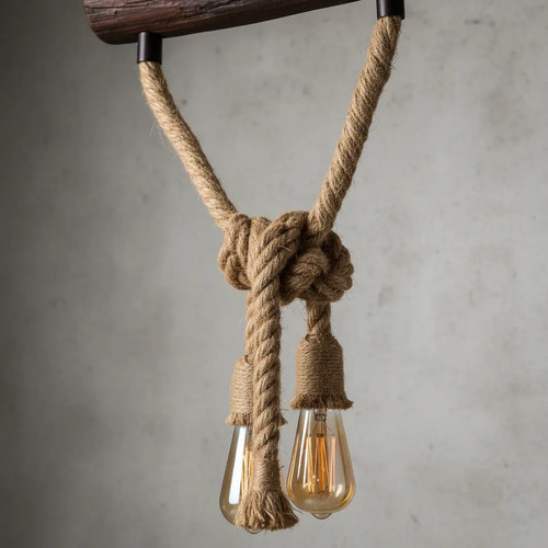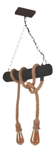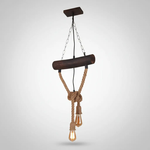 Colgante Rustico Con Cuerdas Y Tronco De Madera 2 Lamparas